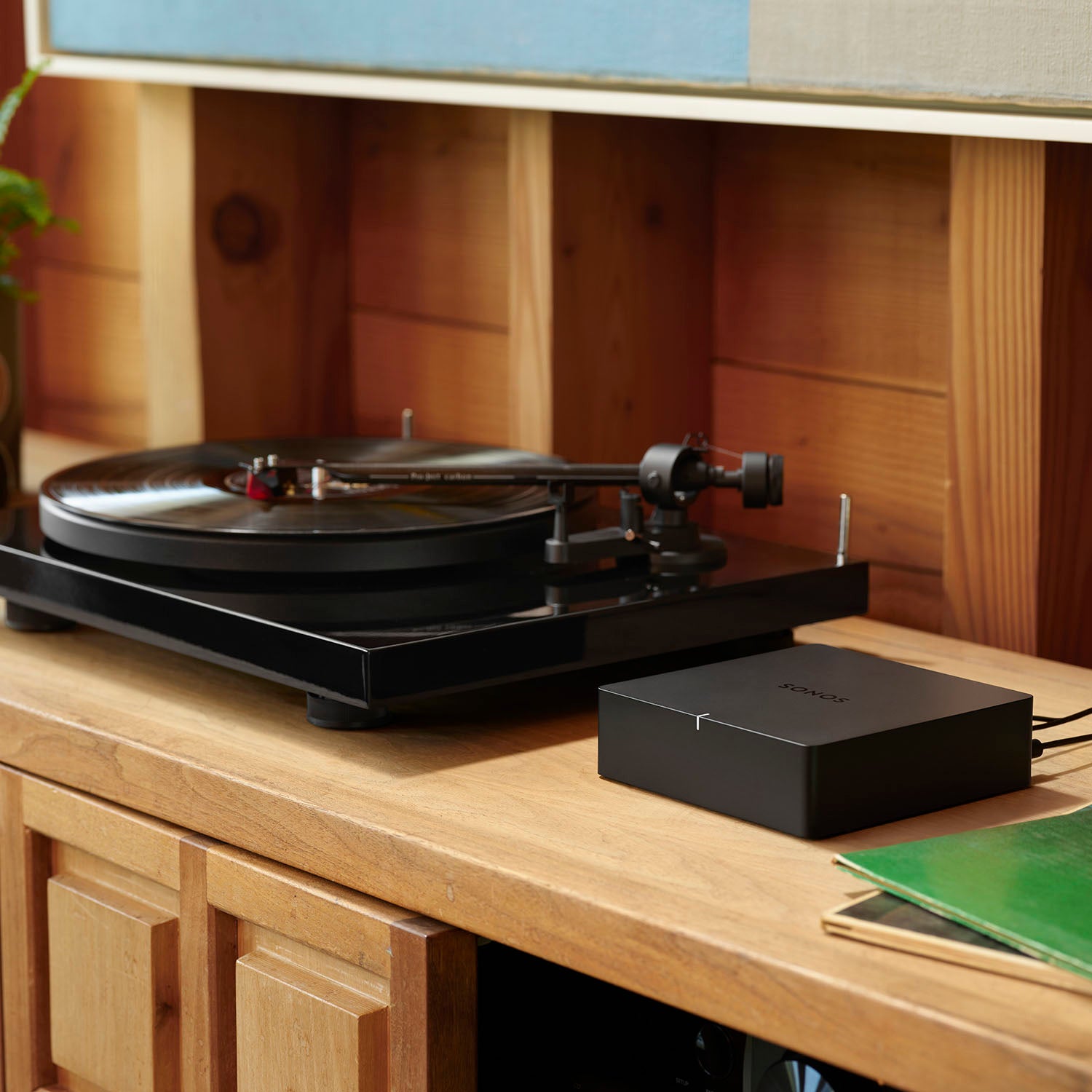 Conecte alto-falantes Sonos sem fio pela casa para uma experiência de audição imersiva, e aproveite discos de vinil, CDs e arquivos de áudio armazenados em outros cômodos.